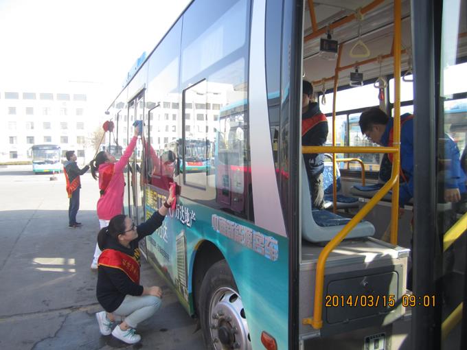 3月15日上午,市公交公司汽車一隊聯合東營市職業學院開展了學雷鋒活動。來自該校經濟貿易與管理學院的大學生和車隊職工共計28人,分兩個小組,一組乘坐公交車上路為特需乘客服務,幫助疏導乘客;一組幫助駕駛員擦拭車身,清掃車廂衛生。大家工作起來井然有序,有條不紊,尤其活躍在車廂為乘客服務的志愿者們,更是得到了乘客的一致好評,成為公交車上一道亮麗的風景。