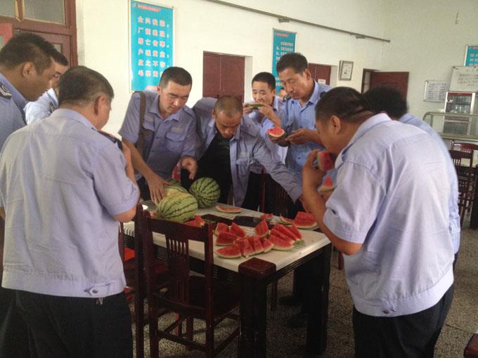 7月13日,三隊駕駛員楊海衛自己買來2000斤西瓜,給在酷暑中堅守工作的廣大工友送來絲絲清涼。