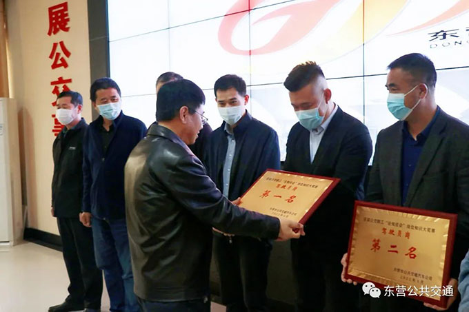 會前,舉行了公司首屆公交職工“應知應會”崗位知識大獎賽頒獎儀式,公司獲獎單位上臺領獎并集體合影。