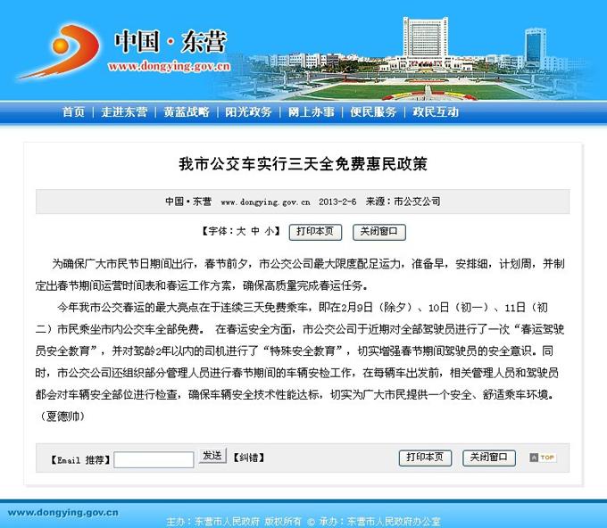 2013年2月1日東營市政府網站報道