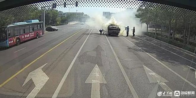 9月10日13點(diǎn)03分,東營公交通勤車隊(duì)駕駛員王維明像往常一樣執(zhí)行124路公交車運(yùn)營任務(wù),當(dāng)他駕車行駛到沂州路與瀏陽河路交叉口紅綠燈時(shí),發(fā)現(xiàn)了異常情況——前方一輛貨車起火了,王師傅沒有絲毫畏懼,立即停車開門,提起車載滅火器沖下了車。